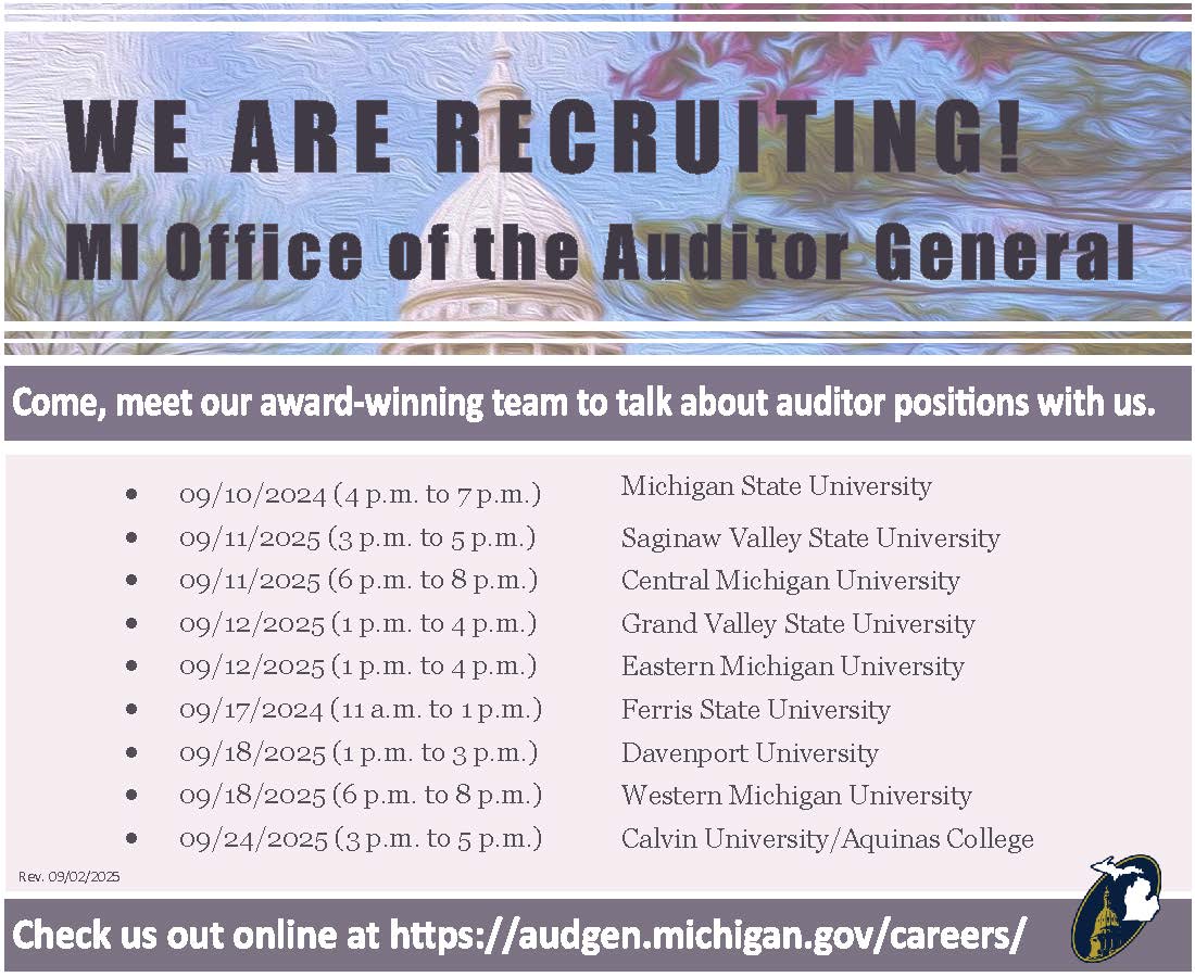 Our search for talented candidates begins at college campuses across the State of Michigan and in our Office. We visit several universities and discuss our Office opportunities with candidates who are ready to begin their careers with the OAG. We also invite candidates to discuss employment opportunities in our Office located near our State’s Capitol. These interviews, along with applicant resumes and transcripts, help us to assess candidates’ skills, abilities, and compatibility with our organization.